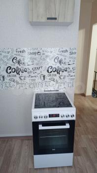 В квартире : новый диван, 1-спальная кровать, кухня, плита с духовкой, обеденный стол, стиральная машинка.