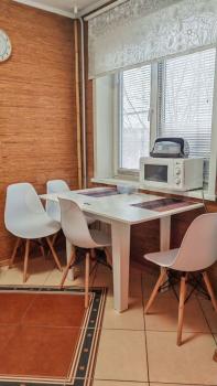 Кухня оборудована необходимой техникой: холодильник, плита, микроволновая печь. Есть обеденный стол и стулья. Санузел раздельный, оснащён стиральной машиной.