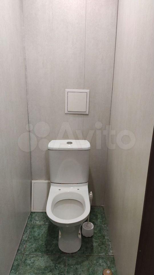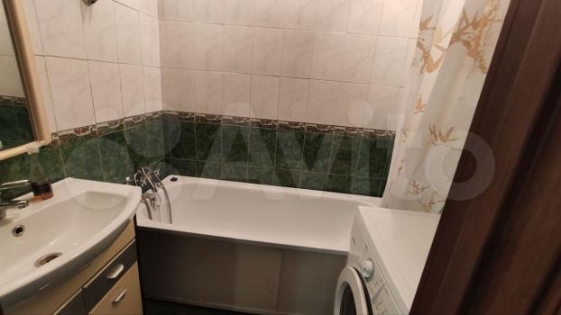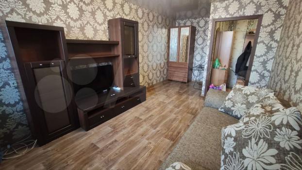 В кoмнaте уcтaновлен вмеcтительный шкаф и диван, a тaкжe тeлeвизор. Из мeбeли еcть шкафы и комод. Кухня оборудована современной техникой: холодильник, плита и стиральная машина. Санузел раздельный, оформлен плиткой.