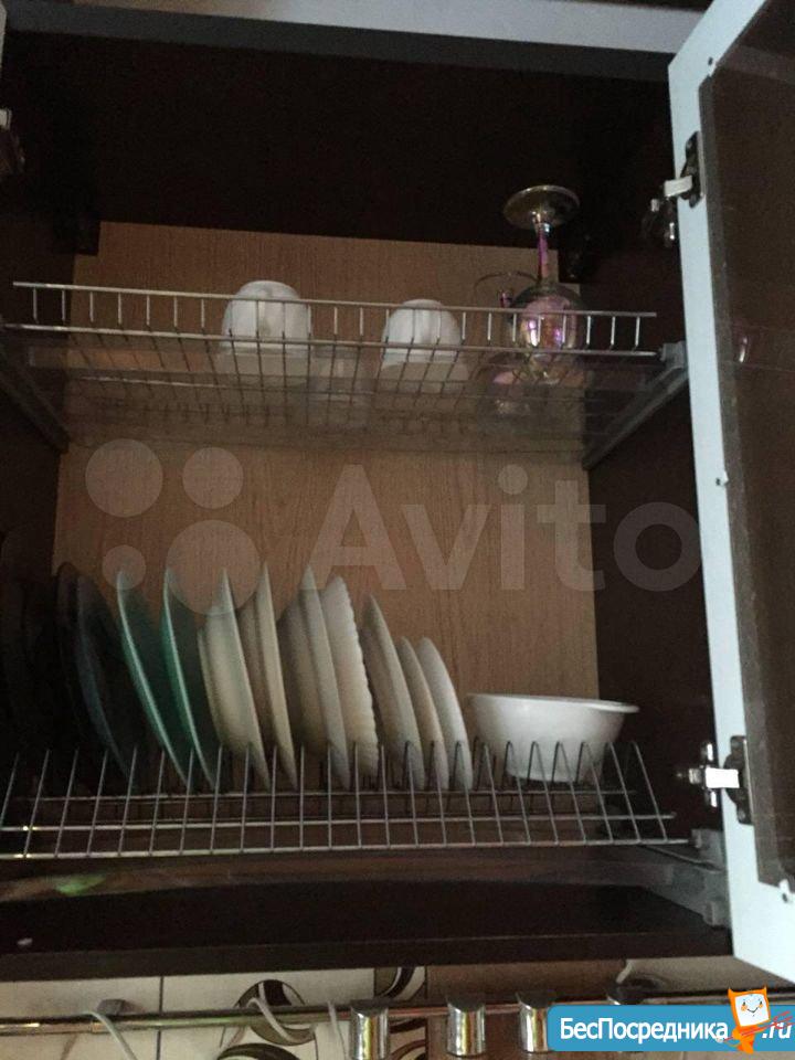 Кухня дизайнерская под заказ, каменная мойка и кран +фильтр для воды, стулья, немецкая встроенная техника (духовка, плита), микроволновка, чайник, холодильник. Потолки натяжные, светильники дорогие и вечные.