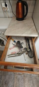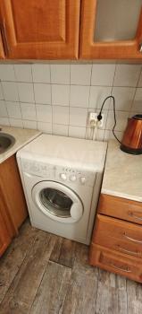 В кухне есть столы, холодильник, электроплитка, мультиварка, немного посуды. Есть стиральная машина автомат в ванной комнате.