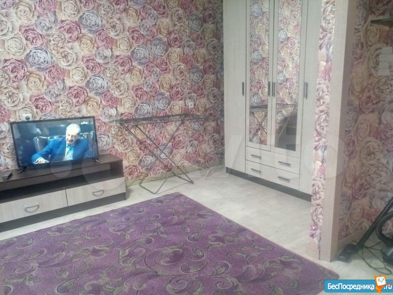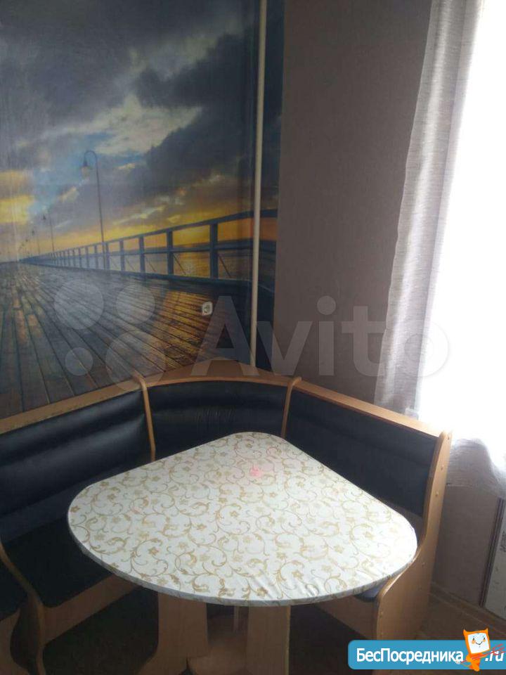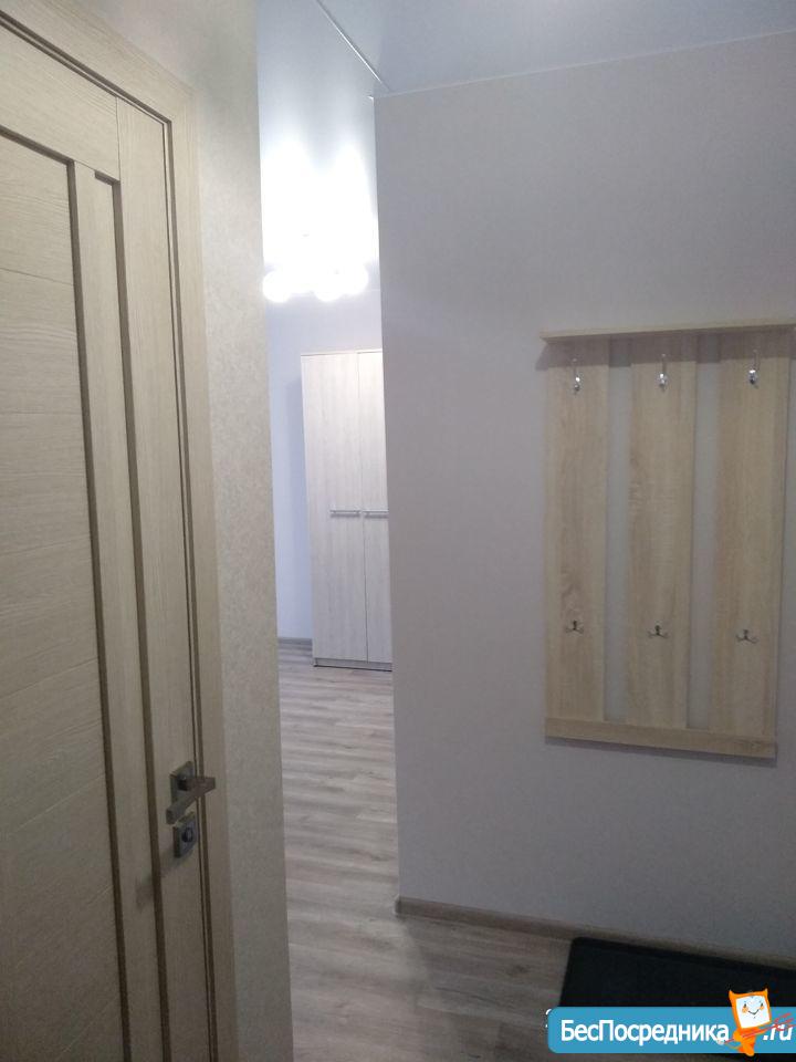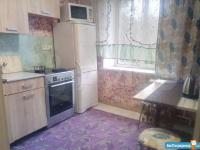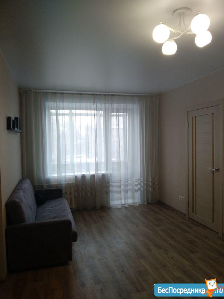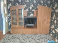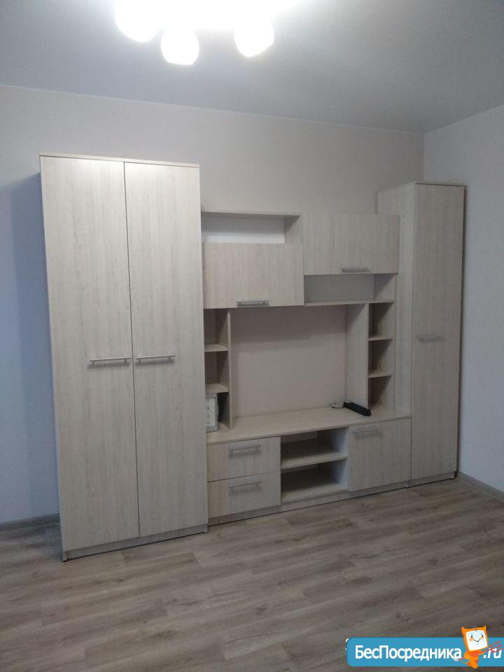 Квартира после ремонта, натяжные потолки, линолеум. Вся мебель новая, имеется: двуспальная кровать, шкаф для одежды, мебельная горка, диван, кухонный гарнитур, обеденный стол, 4 табурета. Также есть столовая и частично кухонная посуда, чайник.