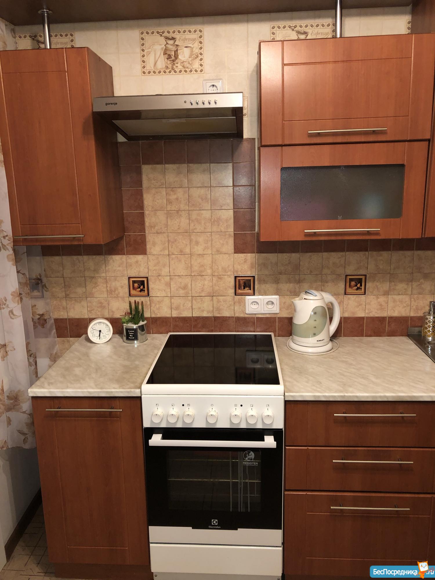 В квартире есть: из электроники плита, холодильник стиральная машина. Мебель: кухонный гарнитур, диван