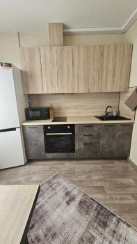 Новая однокомнатная квартира, есть всё для комфортного проживания, раскладной диван, телевизор, шкаф для одежды. Кухня встроенная, полностью оборудована: вытяжка, духовой шкаф, варочная панель, микроволновка, чайник всё на гарантии. Вся посуда, холодильник, стол и 2 табурета. Ванная комната от застройщика. Рядом супермаркеты, остановка в шаговой доступности: Школа #14.
